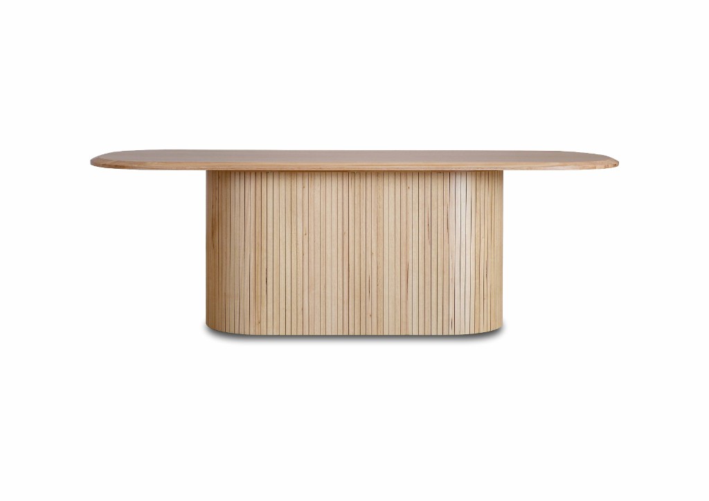 Natural aesthetic & contemporary design made in solid & veneer Messmate • A sleek natural ash finish with vertical slat detailing for textural appeal • Rounded edges and curved profiles deliver a sleek, softened silhouette • Buffet & ETU supplied fully assembled, only tables require assembly • Soft-closing door hinges and metal extension drawer runners • Each furniture piece made from natural timber features unique variations in colour, grain, and knots